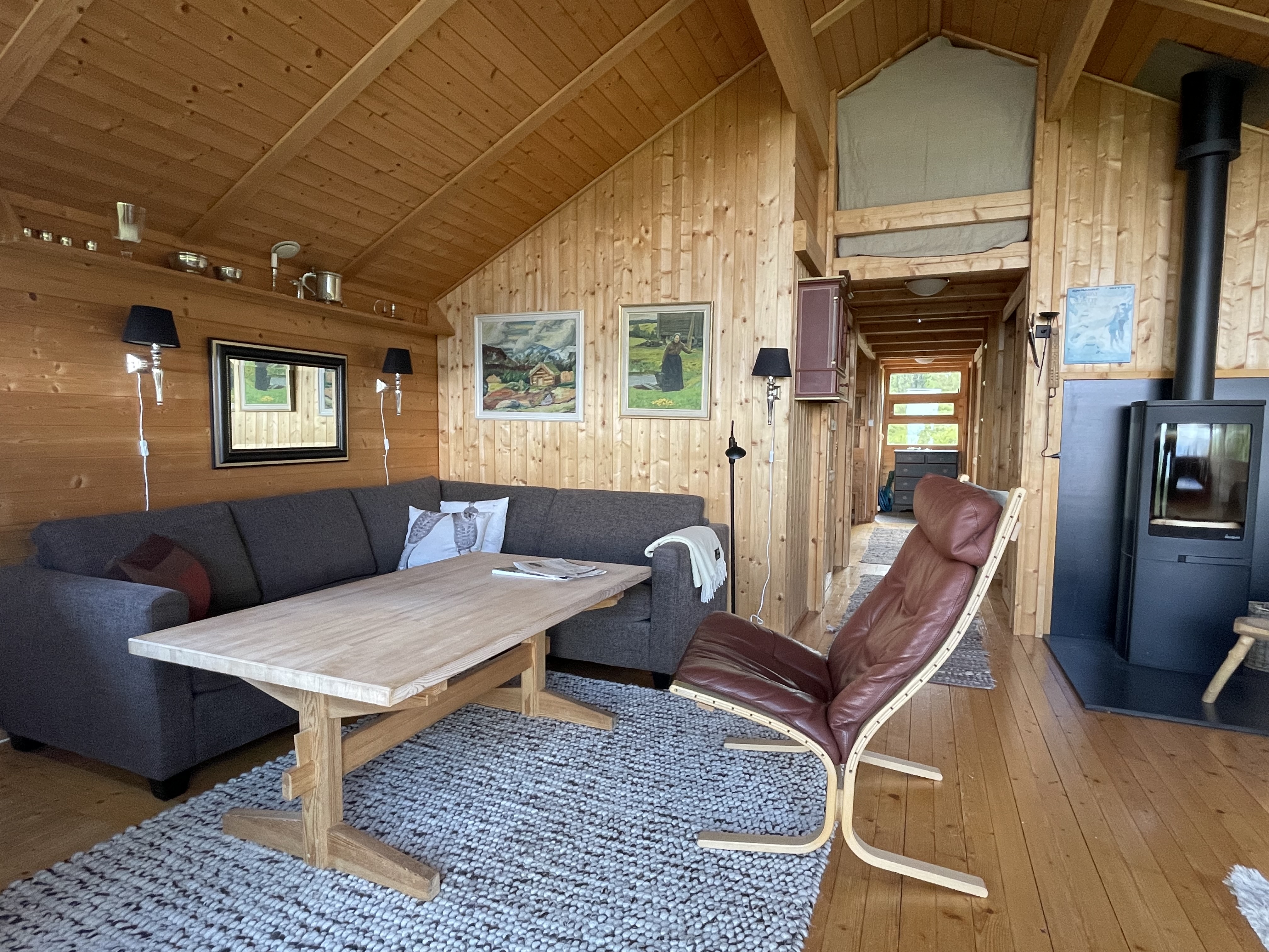 Kjøkkenet er fullt utstyrt med kjøleskap, komfyr, kaffetrakter og oppvaskmaskin, noe som gjør matlaging enkelt og hyggelig for hele familien. Med fire soverom og en romslig hems, har Orrelie plass til opptil 9 personer – perfekt for større familier eller vennegrupper som ønsker å nyte fjellet sammen. Badet har en dusj, og det er et separat rom for toalett.
